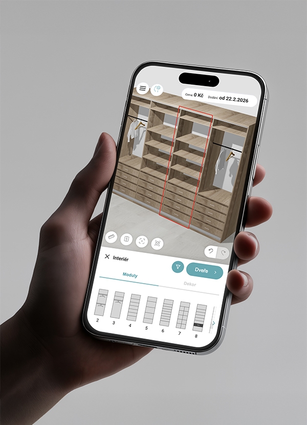 Navrhněte vestavěnou skříň v realistickém 3D prostředí – od místnosti až po poslední detail vnitřního vybavení. Zákazník vidí výsledek okamžitě, vy dostáváte hotovou poptávku připravenou k výrobě.