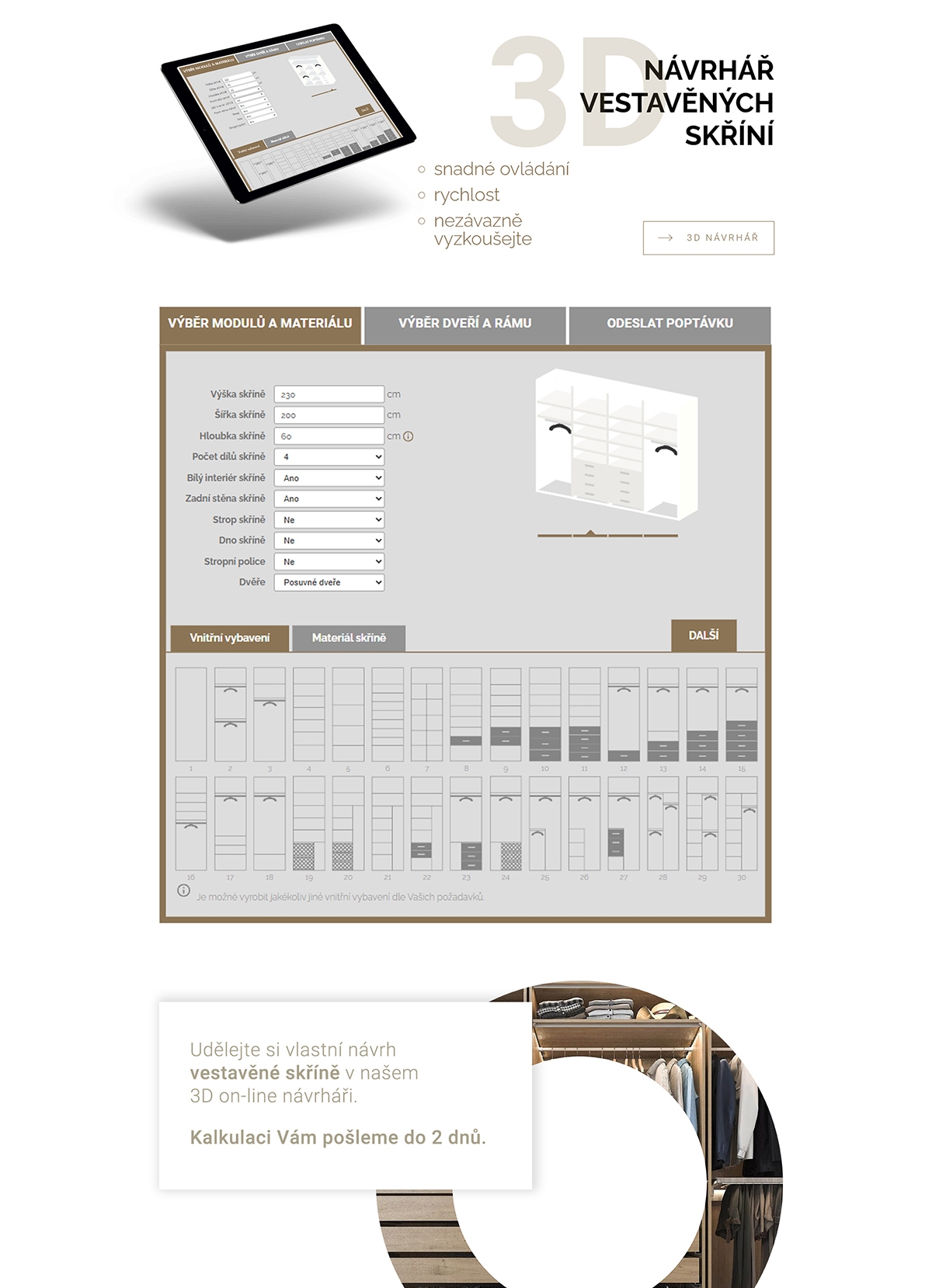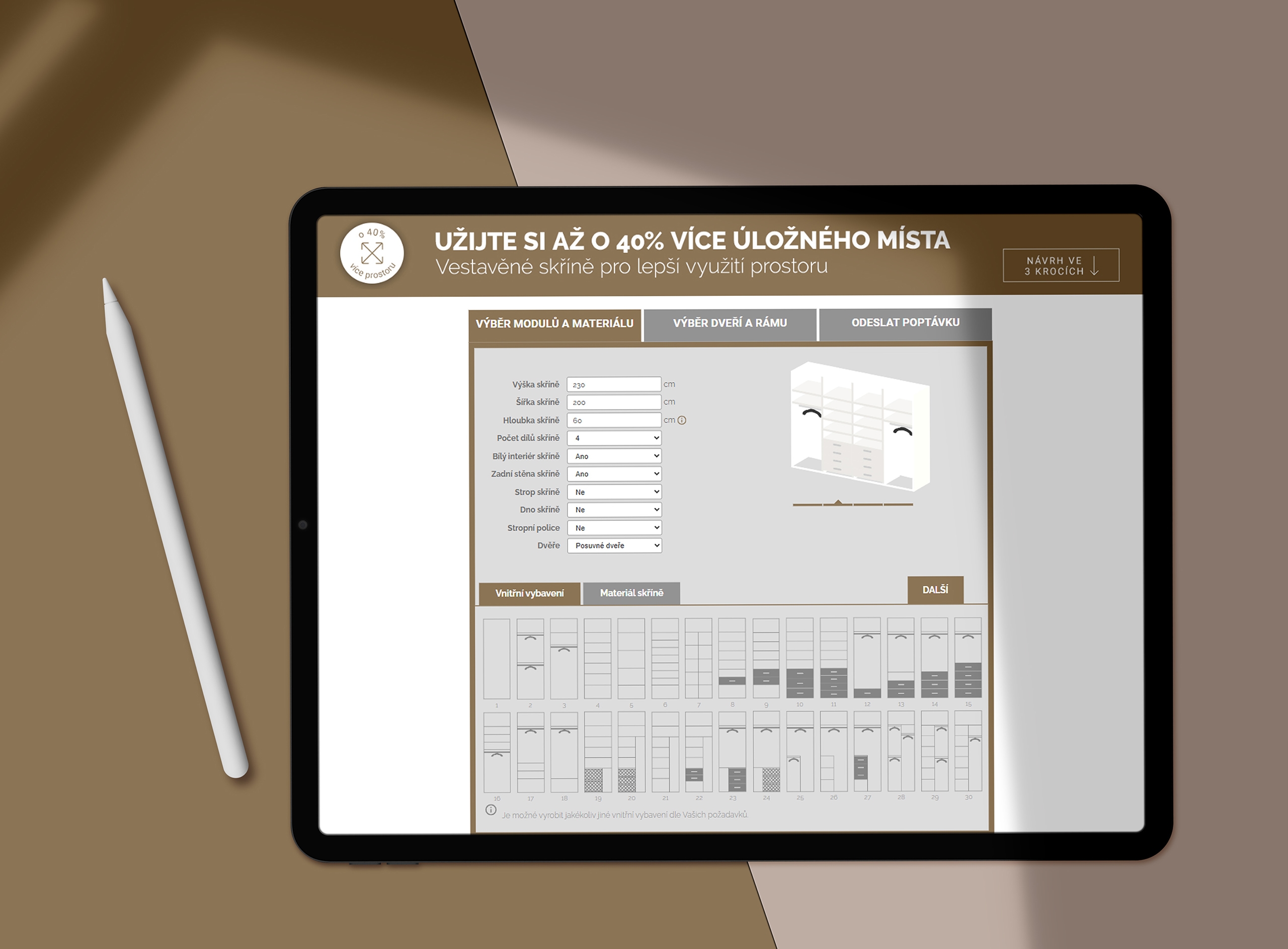 Navrhli jsme UX/UI a design, připravili branding včetně loga a nasadili kompletní online marketing (PPC Booster, VISIBILITY 360). Klíčovým prvkem je návrhář skříní, kde zákazník ve 3 krocích specifikuje skříň a odešle poptávku – rychle, přehledně a bez zbytečných bariér.