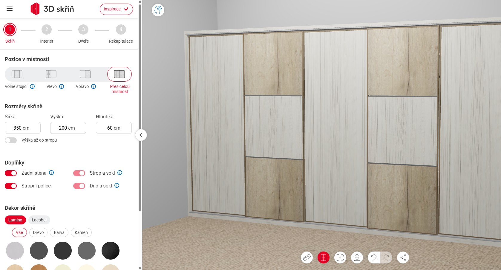 Zákazník si nastaví místnost – rozměry, podlahu, barvu stěn. Okamžitě vidí skříň v reálném kontextu.
