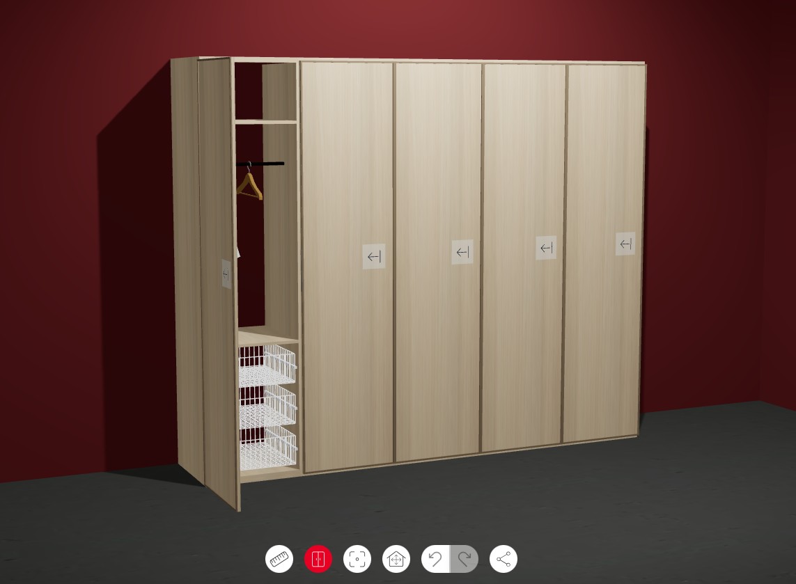 Volba rozměrů, modulů, dveří, dekorů, vnitřního vybavení i doplňků. Vše ve 3D, s animacemi a kótami.