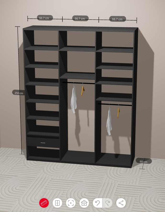 Navrhněte vestavěnou skříň v realistickém 3D prostředí – od místnosti až po poslední detail vnitřního vybavení. Zákazník vidí výsledek okamžitě, vy dostáváte hotovou poptávku připravenou k výrobě.