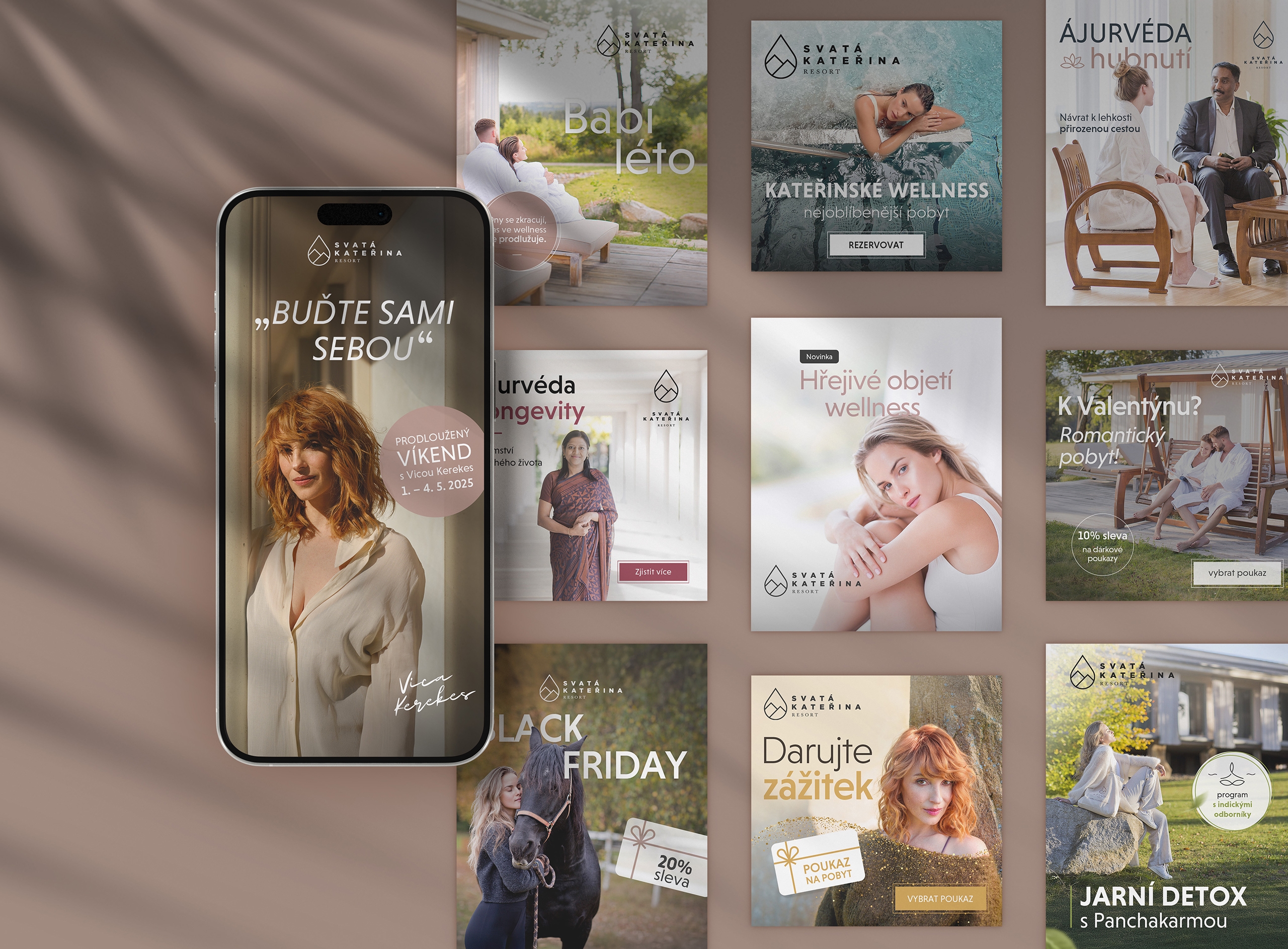 Vizuály navrhujeme tak, aby byly konzistentní s charakterem resortu: klid, čistota, přírodní prostředí a prémiová péče. Bannery stavíme na jasné hierarchii sdělení (program / benefit / výzva k akci) a připravujeme je v sadách pro různé formáty a umístění, aby fungovaly napříč kampaněmi a sezónními tématy (wellness pobyty, ájurvéda, jógové víkendy, pobytové balíčky).